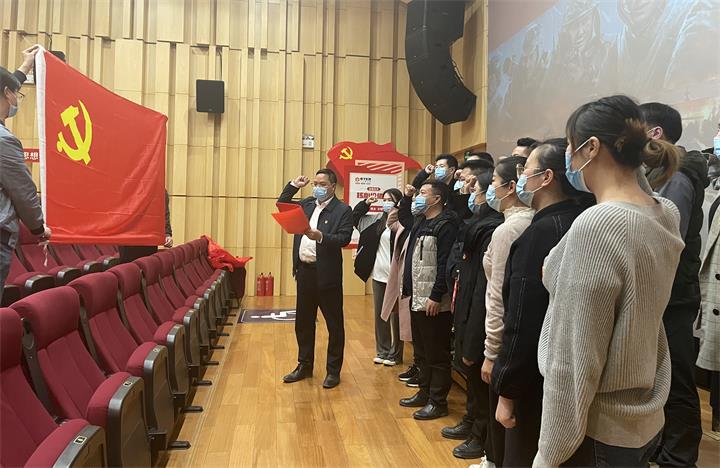 觀影前,面向鮮紅的黨旗,城投實業(yè)黨支部副書記聶茂良帶領(lǐng)全體黨員干部職工重溫入黨誓詞。